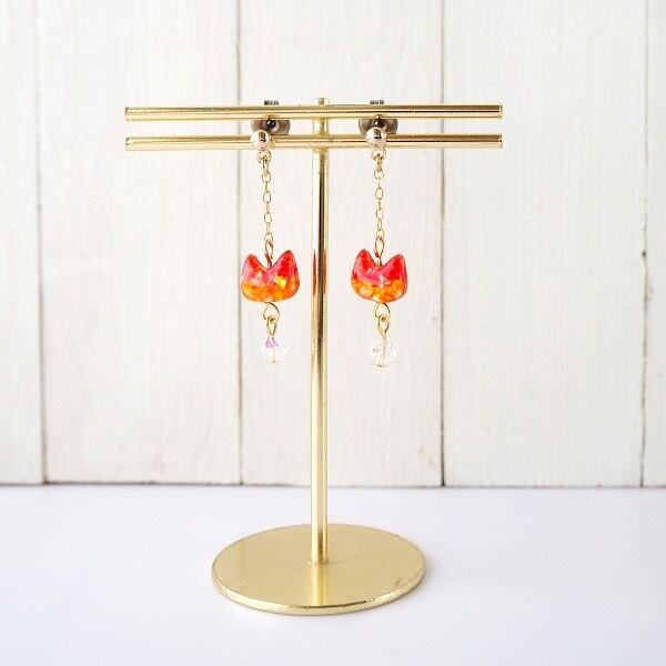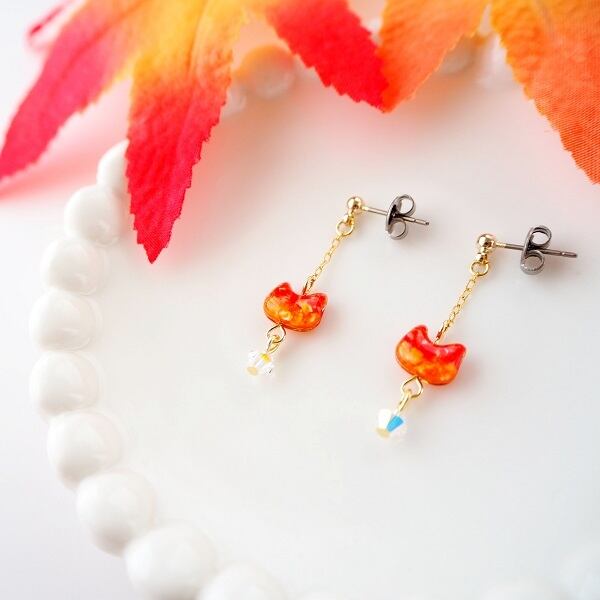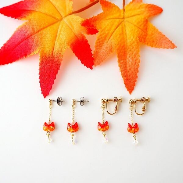 小さな猫に秋の情景を閉じ込めた、耳元で可愛らしく揺れるアクセサリーです。
