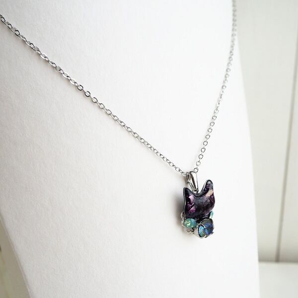 レジンでぷっくりつやつやな白猫の首元に、ビジューが輝くペンダントです。