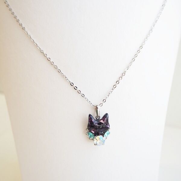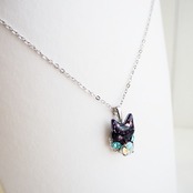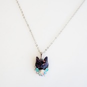 レジンでぷっくりつやつやな黒猫の首元に、ビジューが輝くペンダントです。