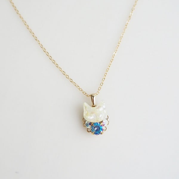 レジンでぷっくりつやつやな白猫の首元に、ビジューが輝くペンダントです。
