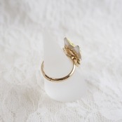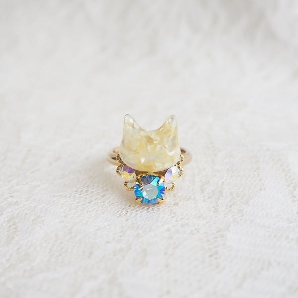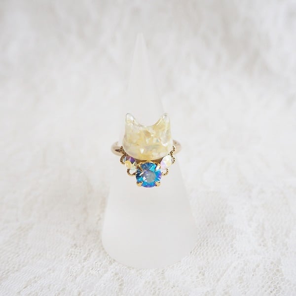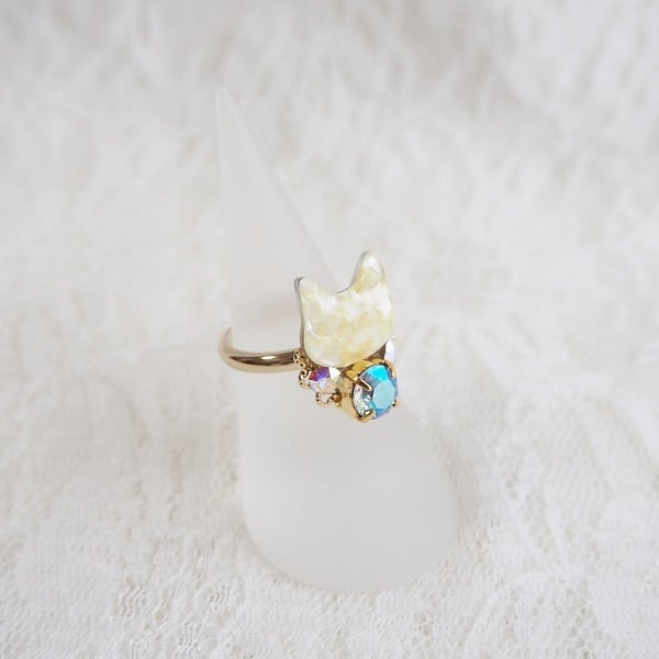 レジンでぷっくりつやつやな白猫の首元に、ビジューが輝くリングです。