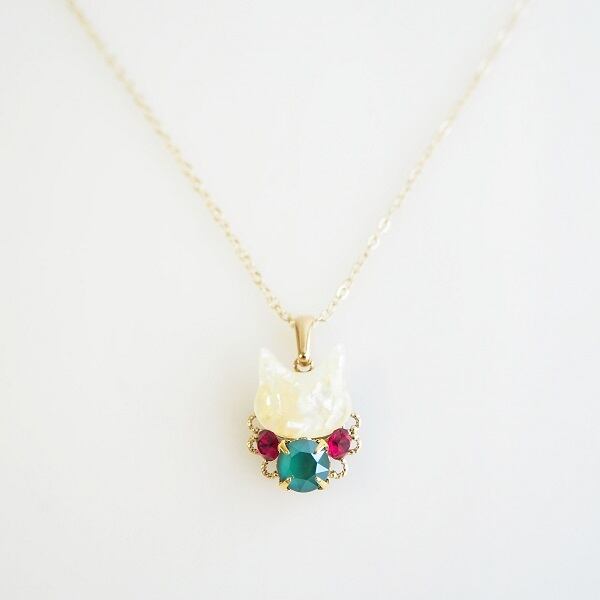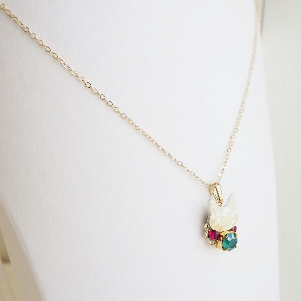 レジンでぷっくりつやつやな白猫の首元に、ビジューが輝くペンダントです。