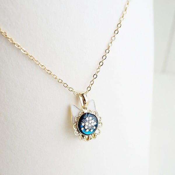 レジンでぷっくりつやつやな白猫の首元に、ビジューが輝くペンダントです。